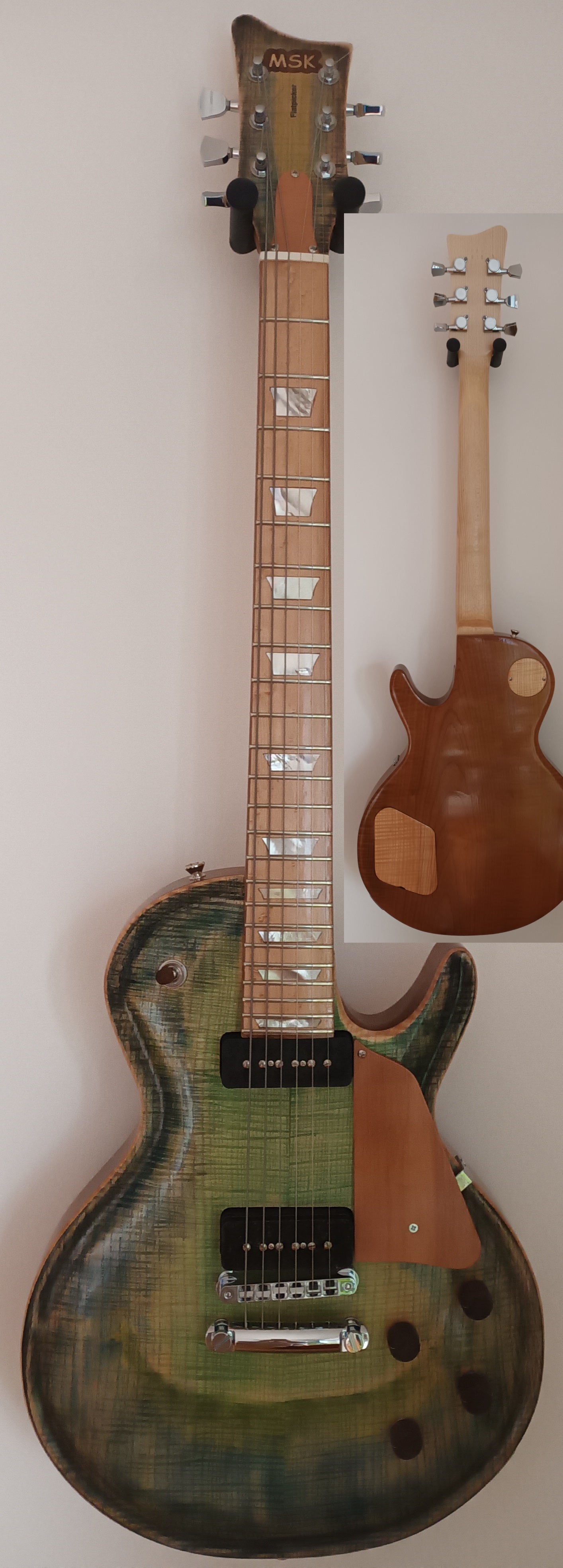 Die Les Paul-Variante mit 24 Bünden für erleichtertes Solieren in den hohen Lagen, gebaut aus heimischen Hölzern (Ahorn, Nussholz und Birne) und ohne Plastik, in die Schaltung integrierter PreAmp für den Lautstärke-Booster und ein wenig Verzerrung, niedrige Saitenlage für für müheloses schnelles Spiel.