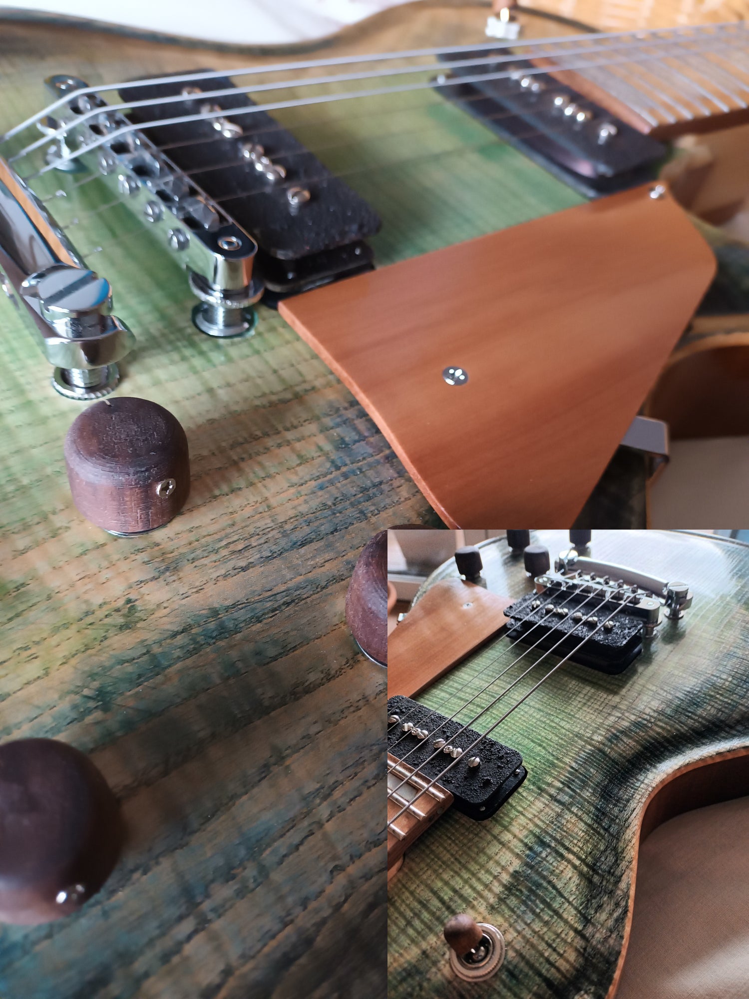 PRS-style Gitarre, Griffbrett aus Pflaumenholz, Ahornbinding, Ahorndecke gewölbt, sehr leicht gängiges Tremolo, 5-way-Megaswitch. Zugang zum Tremolo über Magnet-verschließbaren Deckel.